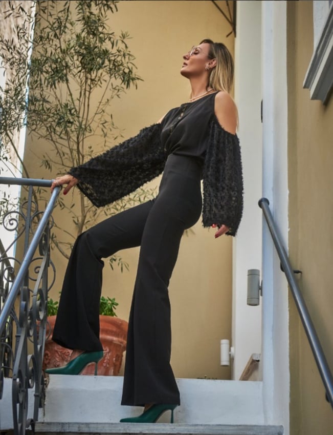 Μαύρη μπλούζα με έξω ώμους και εντυπωσιακά μανίκια