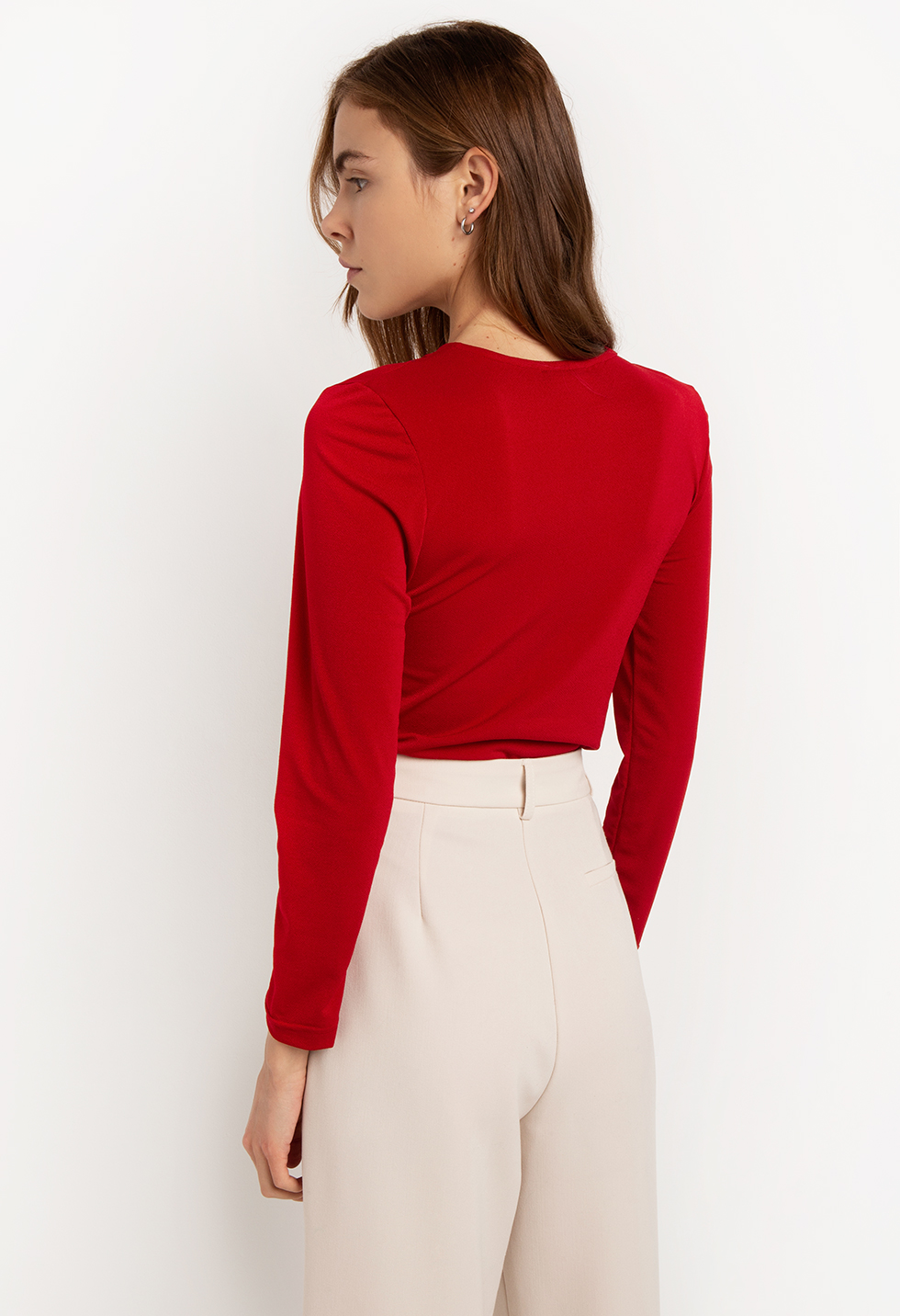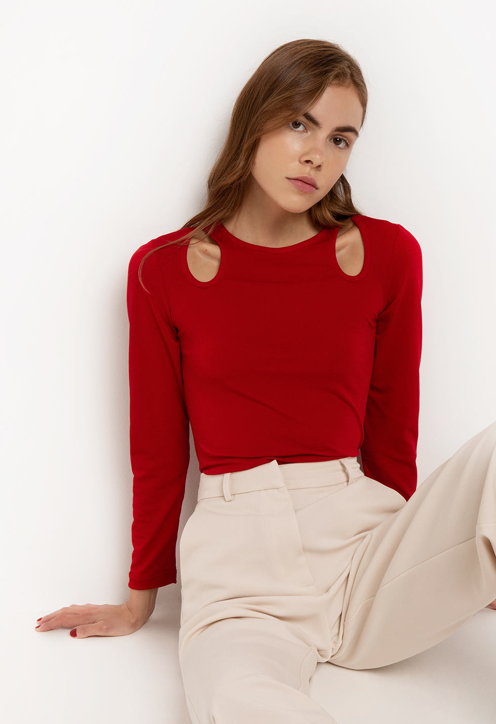 Ελαστικό τοπ κόκκινο χρώμα με μικρά ανοίγματα κοντά στο λαιμό στους ώμους. Έχει στρογγυλή λαιμόκοψη και μακριά μανίκια.