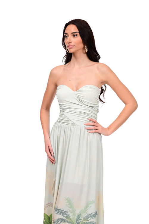 Φόρεμα στράπλες αέρινο σε βεραμάν χρώμα με ιδιαίτερα jungle σχέδια στο κάτω μέρος και ωραίο άνοιγμα στο πόδι.
