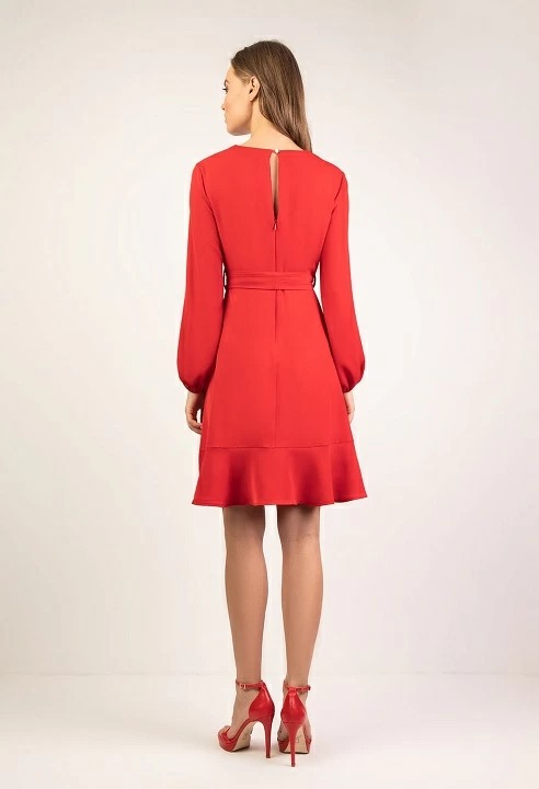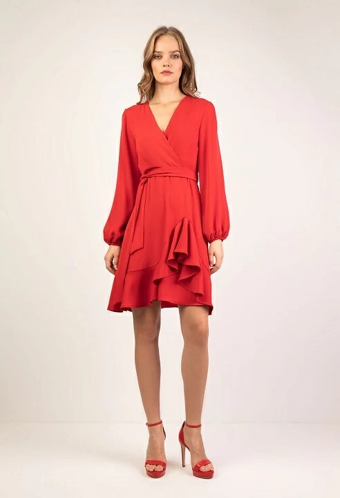 Κοντό κόκκινο φόρεμα, κρουαζέ στο στήθος, με μακριά μανίκια , ζώνη στη μέση και ένα παιχνιδιάρικο βολάν μπροστά στη φούστα.