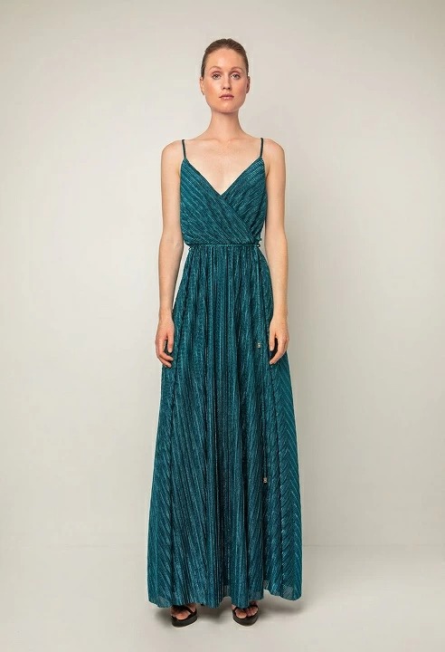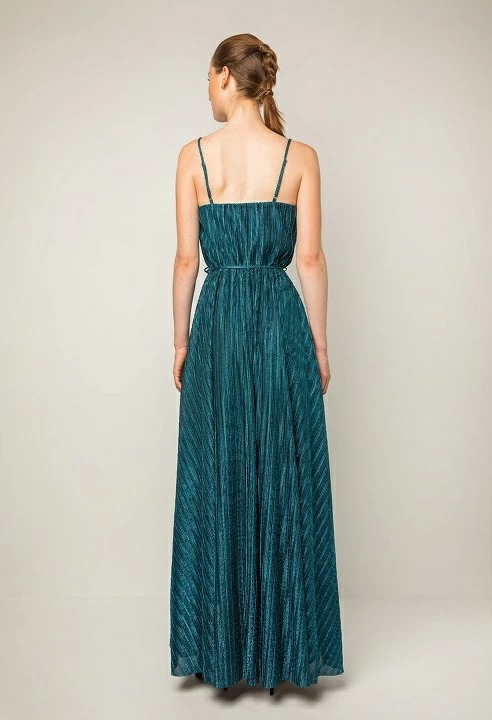 Μακρύ κλος φόρεμα με ύφασμα σε λεπτό ματαλλιζέ πλισέ, ζώνη στη μέση, ρυθμιζόμενες λεπτές τιράντες και κρουαζέ στο μπούστο.