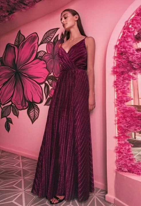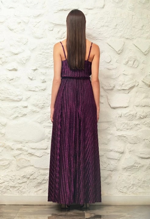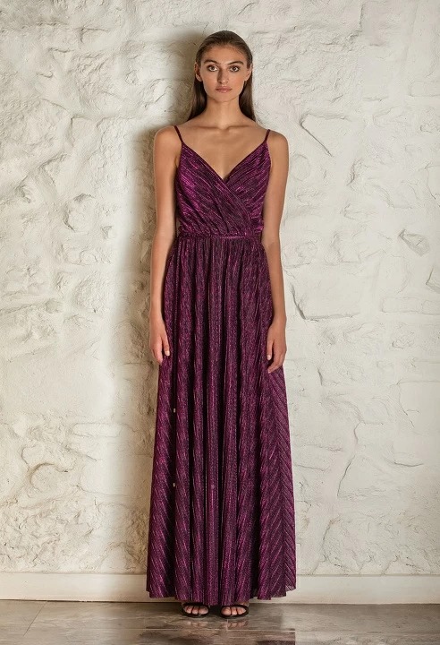 Μακρύ κλος φόρεμα με λεπτό μεταλλιζέ πλισέ ύφασμα, ζωνάκι στη μέση, κρουαζέ στο μπούστο και λεπτές ρυθμιζόμενες τιράντες.