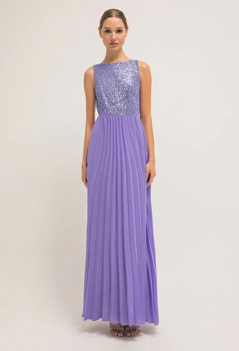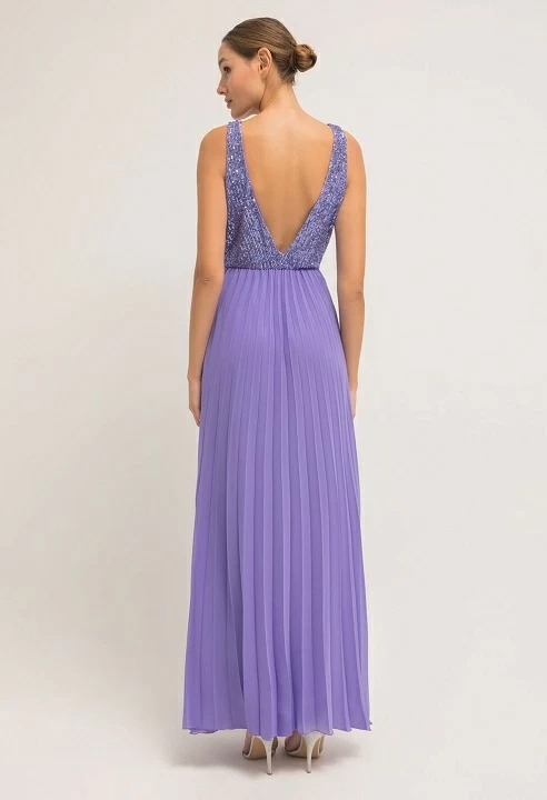 Μακρύ μωβ φόρεμα με παγιέτα στο μπούστο, ανοιχτή πλάτη και πλισέ φούστα