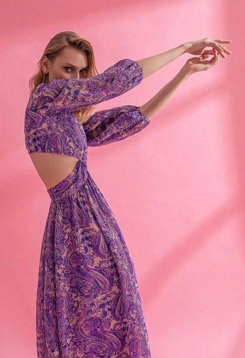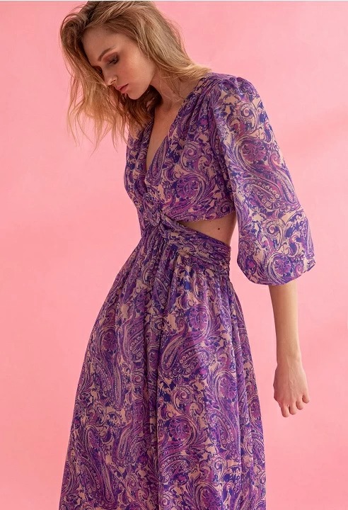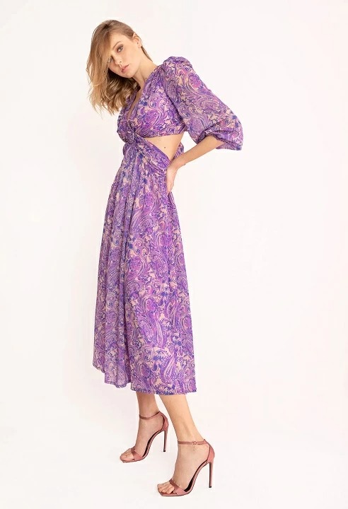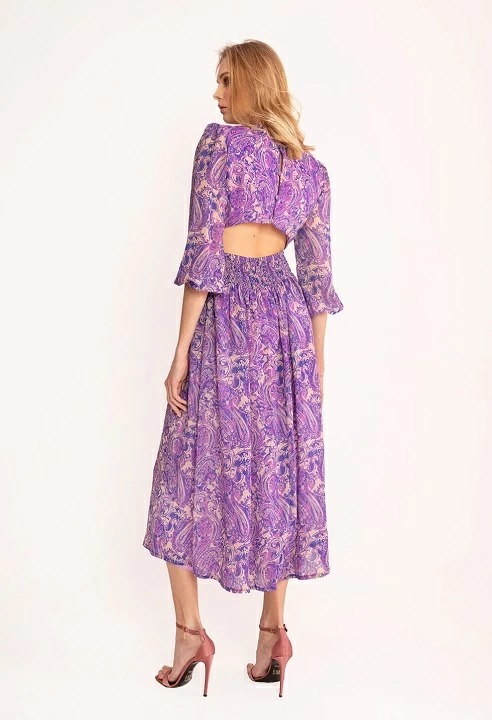Μίντι εμπριμέ φόρεμα σε μώβ και λιλά αποχρώσεις με V στο στήθος και άνοιγμα στημ πλάτη. Έχει βάτες στους ώμους και μανίκια 3/4 που καταλήγουν σε λάστιχο, κλείσιμο στην πλάτη με ασορτί φοδραρισμένα κουμπιά και ελαστική μέση.