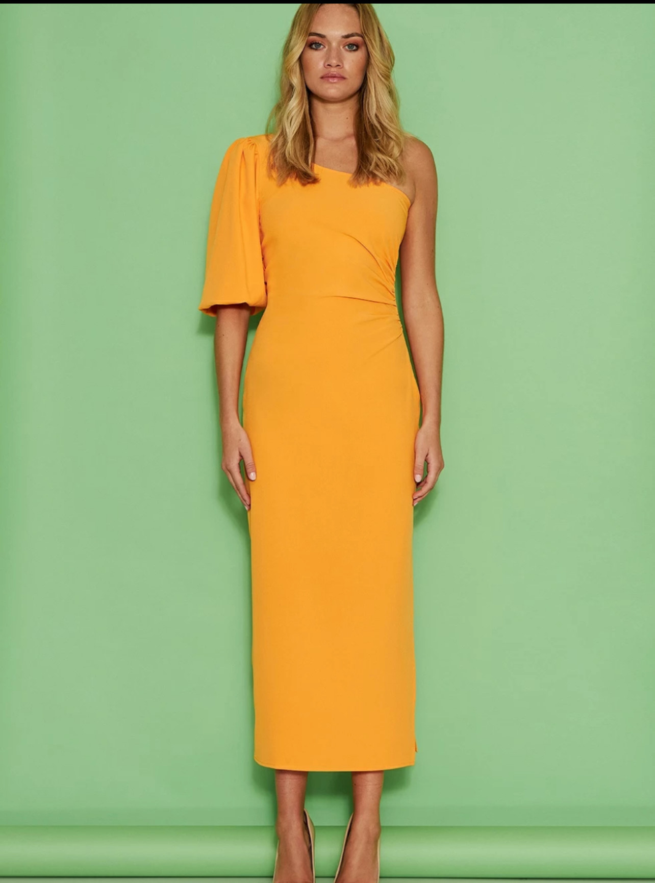 Μίντι φόρεμα με ένα μανίκι σε ίσια γραμμή και σκίσιμο στο πλάι.