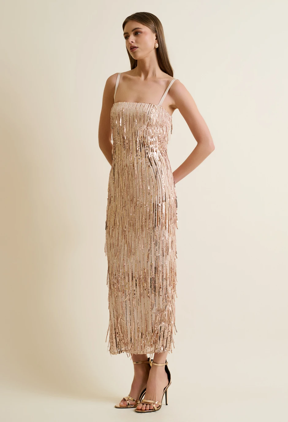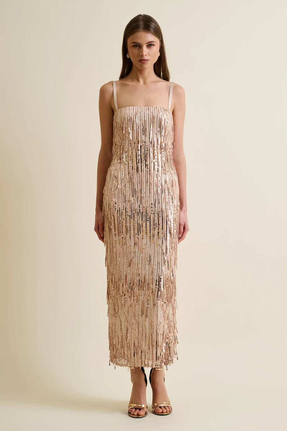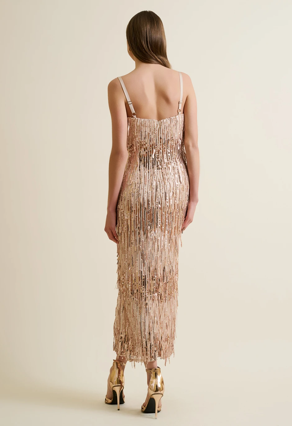 Μίντι παγιετένιο φόρεμα με κρόσια παγιέτες σε χρυσό μπρονζέ χρώμα. Έχει ρυθμιζόμενα τιραντάκια και σκίσιμο στο πλάι.