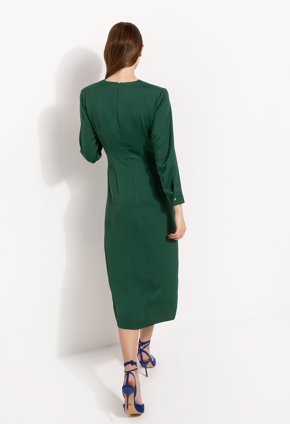 Μίντι ίσιο φόρεμα σε πολύ ωραίο κρεπ ύφασμα, με κόμπο εμπρός που καλύπτει έξυπνα κοιλίτσα , με μακριά μανίκια και σκίσιμο στο πλάι.