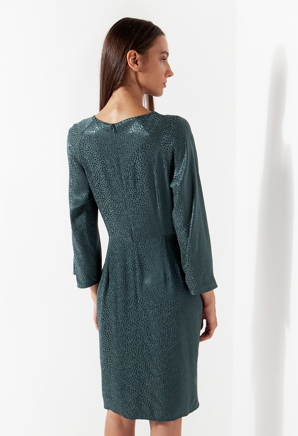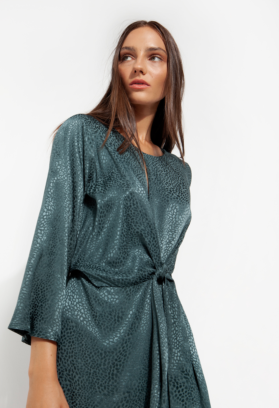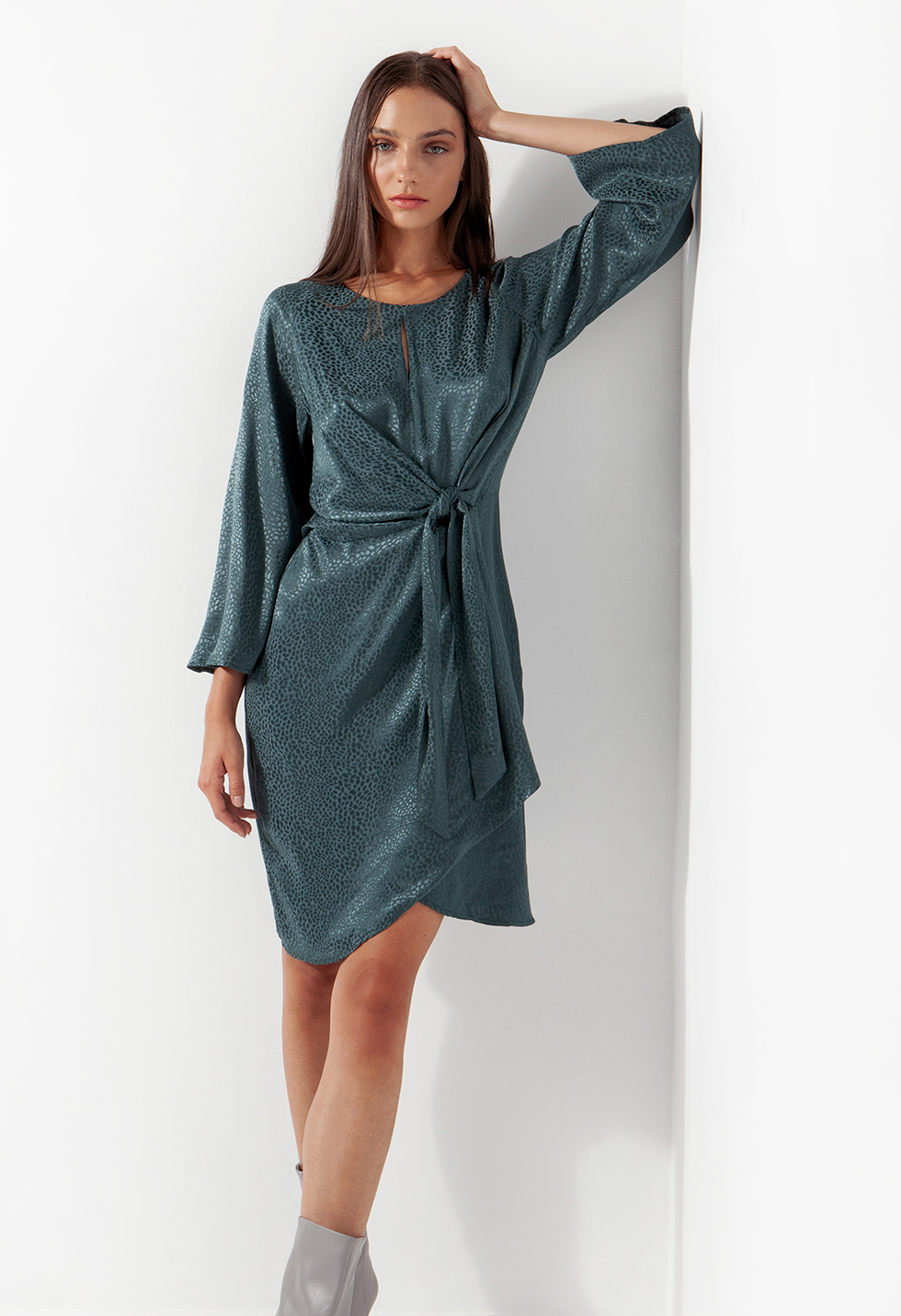Μίντι ίσιο πράσινο φόρεμα με μακριά μανίκια και ανάγλυφο ύφασμα. Στο εμπρός μέρος της φούστας κάνει ένα δέσιμο και καλύπτει έξυπνα την κοιλίτσα!!!