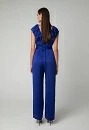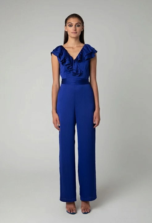 Μπλε ολόσωμη φόρμα σε σατινέ ύφασμα με βολάν και V στο στήθος
