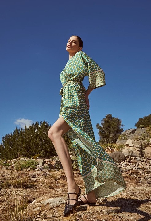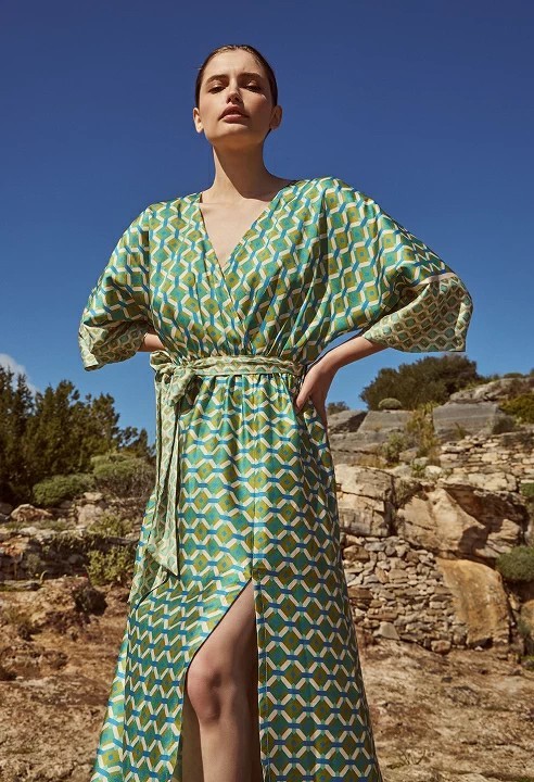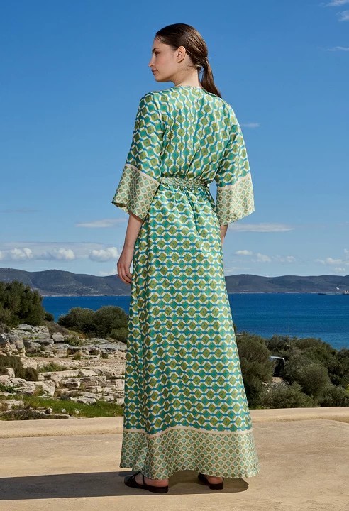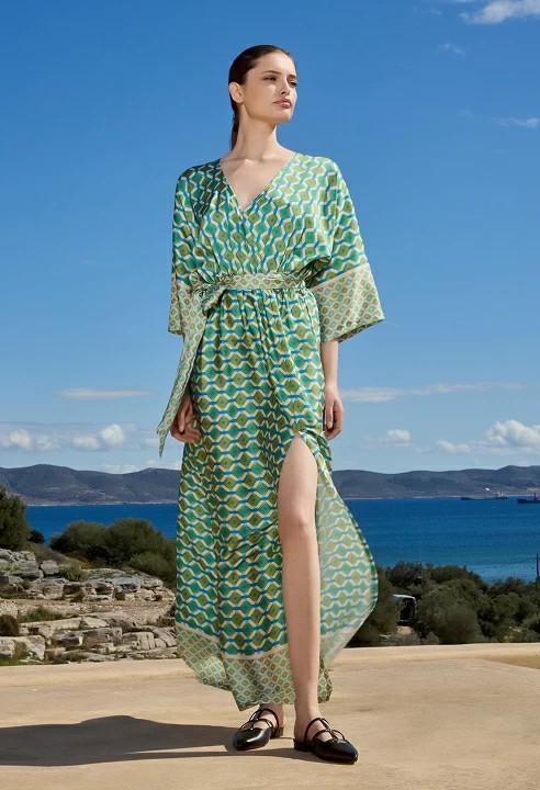 Φόρεμα εμπριμέ με V ντεκολτέ κρουαζέ, με φαρδύ μανίκι κάτω από τον αγκώνα, ελαστική μέση με ζώνη από το ίδιο ύφασμα, έχει στο κάτω μέρος σκίσιμο στο πλάι και κανονική εφαρμογή.